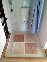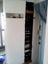 そして、これまた珪藻土を塗って仕上げました。靴を入れる棚の部分は茶色のペンキで塗りました。 中途半端な小棚を左側に作ってしまいました・・・ もっと高くしないと、何も飾れません・・・。 靴箱は大きいので、圧迫感があると思いましたが、逆に裏側の洗濯機が隠せてとても良かった。 |