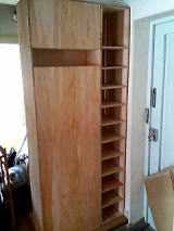 これは玄関左側の靴箱です。 あくちが一人で、えっちらおっちら作ったものです。厚めのコンパネで作ったのですが、さすがに、反ってしまって・・・ 経費削減といってもほどほどに。 適した材をホームセンターのお兄さんにしっかりアドバイスしてもらいましょう! ちなみに棚の左側の部分は、裏に洗濯関連道具がしまえるように、もとい、押し込めるようになっています^^; |