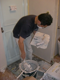 | お店に一度珪藻土塗りの体験に行って、道具も一式貸してもらえました。 | 厚めに!厚めに塗りましょう!!塗ったときの音で分かります。ざらざらと音がしたらだめ!す〜っと滑らかにぬれる厚さでいきましょう!! 質感がかなり違います。 |